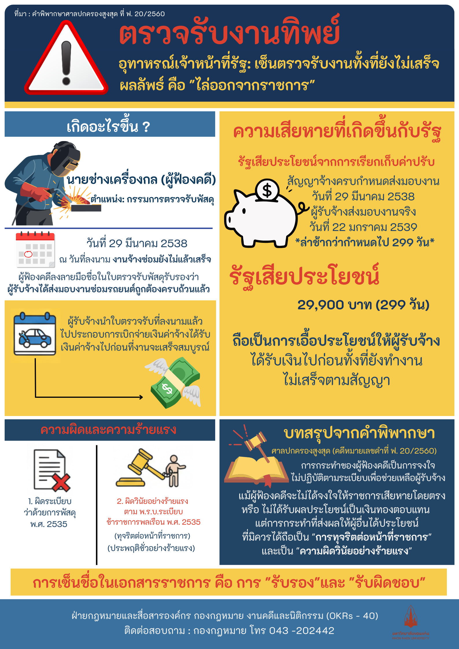 บทความทางกฎหมายUncategorized ตรวจงานทิพย์… ไล่ออกจากราชการ โดย Admin2 - September 10, 2025 0 524 Facebook Twitter Pinterest WhatsApp Post Views: 593 บทความที่เกี่ยวข้องเพิ่มเติมจากผู้เขียน ประกาศผลการคัดเลือกผู้แทนผู้ปฎิบัติงานมหาวิทยาลัย (ก.อ.ม.) ต่อเติมบ้านอย่างไรไม่ให้ผิดกฎหมาย PDPA กับการทำงานประจำวัน การพ้นสภาพการเป็นนักศึกษาก่อนสำเร็จการศึกษา ถือเป็นการผิดสัญญาและต้องชดใช้เงินและเบี้ยปรับตามสัญญาหรือไม่ โครงการให้ความรู้อบรมเกี่ยวกับกฎหมาย หัวข้อ บริหารอย่างไรเพื่อไม่ให้ถูกร้องเรียนและเกิดคดีความจากกรณีศึกษาที่เกิดขึ้นในสถาบันอุดมศึกษา