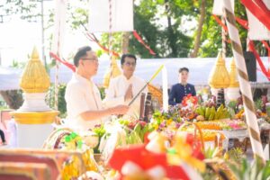 เวลา 08.09 น. รศ.นพ.ชาญชัย พานทองวิริยะกุล อธิการบดีมหาวิทยาลัยขอนแก่น ประธานในพิธี ได้เปลี่ยนผ้าอังสะพระพุทธปัญญาเมตตาธรรม จุดธูปเทียนบูชาพระรัตนตรัยและเจ้าพ่อมอดินแดง ประธานในพิธียังได้ปักธูปหน้าโต๊ะเครื่องบวงสรวง และที่กระถางหน้าโต๊ะเครื่องไหว้บริวารพร้อมกล่าวคำบูชา พราหมณ์ได้นำบูชาเทพยดา อัญเชิญเทวดา อ่านโองการ รวมถึงนำบูชาสักการะและถวายเครื่องบวงสรวงแก่เจ้าพ่อมอดินแดง ประธานในพิธียังได้โปรยข้าวตอกดอกไม้ ลั่นฆ้องชัย 3 ลา คณะผู้บริหาร นักศึกษา และผู้ศรัทธา ร่วมปักธูปที่กระถางธูปบูชาเจ้าพ่อมอดินแดง