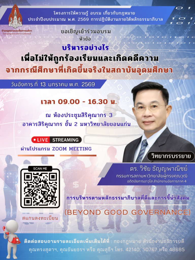 บทความทางกฎหมายUncategorized โครงการให้ความรู้อบรมเกี่ยวกับกฎหมาย หัวข้อ บริหารอย่างไรเพื่อไม่ให้ถูกร้องเรียนและเกิดคดีความจากกรณีศึกษาที่เกิดขึ้นในสถาบันอุดมศึกษา โดย Admin2 - January 7, 2026 0 37 Facebook Twitter Pinterest WhatsApp Post Views: 25 บทความที่เกี่ยวข้องเพิ่มเติมจากผู้เขียน โครงการให้ความรู้อบรมเกี่ยวกับกฎหมายระเบียบแบบแผนมาตรฐานจริยธรรม จรรยาบรรณ รู้ทันโกง…ความแตกต่างระหว่างฉ้อโกง & ฉ้อโกงประชาชน ยักยอกทรัพย์ แนวคำวินิจฉัยของศาลเกี่ยวกับอำนาจศาลในคดีต้นไม้ในมหาวิทยาลัยล้มทับทรัพย์สิน คดีวินัยต้องอุทธรณ์คำสั่งลงโทษก่อนฟ้องและไม่ต้องฟ้องเพิกถอนคําสั่งแต่งตั้งกรรมการสอบสวน
